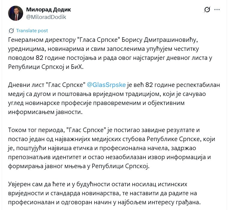 Povodom te obljetnice oglasili su se mnogi, ali izdvojićemo objavu na X predsjednika Milorada Dodika, koji to nekako najljepše sroči, a i ovi iz Federacije BiH da malo provježbaju ćirilicu.