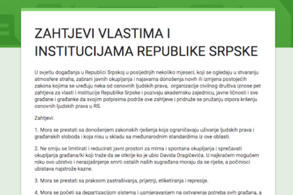 Organizacije civilnog društva su pred vlasti i institucije Republike Srpske stavile pet zahtjeva i pozivale akademsku zajednicu, javne ličnosti i…