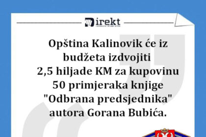 Opština Kalinovik će iz budćetske rezerve izdvojiti 2,5 hiljada maraka za kupovinu 50 primjeraka knjige "Odbrana predsjednika" Gorana Bubuća. Izdajica…