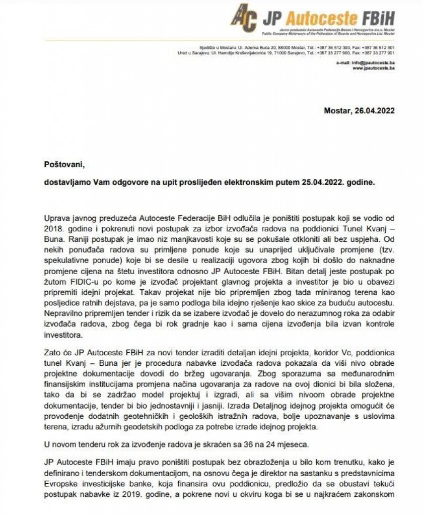 „Takav projekt nije bio pripremljen zbog tada miniranog terena kao posljedice ratnih djelovanja, pa je samo podloga bilo idejno rješenje kao skice za buduću autocestu. Nepravilno pripremljen tender i rizik da se izabere izvođač je dovelo do nerazumnog roka za odabir izvođača raddova, zbog čega bi rok izgradnje kao i sama cijena izvođenja bila izvan kontrole investitora. Nova Uprava JP Autoceste Federacije BiH d.o.o  odlučila je poništiti postupak za koji je odluka o pokretanju donesena 2018. godine i pokrenuti novi postupak za izbor izvođača radova na poddionici Tunel Kvanj – Buna. Raniji postupak je imao niz manjkavosti koje su pokušale otkloniti, ali bez uspjeha. Zato će JP Autoceste Federacije BiH d.o.o Mostar za novi natječaj izraditi detaljan idejni projekt, koridor Vc poddionica tunel Kvanj – Buna jer je procedura nabavke izvođača radova pokazala da viša razina obrade projektne dokumentacije dovodi do bržeg ugovaranja“, naveli su.