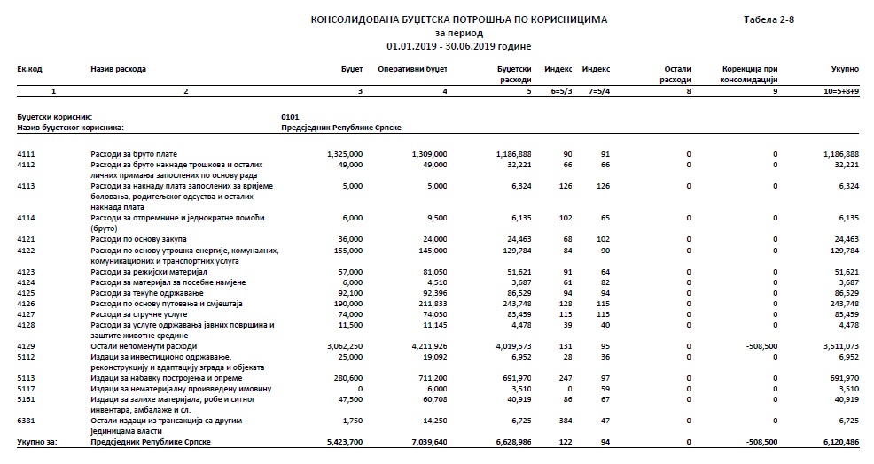 Tako je budžet za instituciju Predsjednika RS u prvih šest mjeseci bio 5,42 miliona, a potrošeno je 6,12 miliona KM. Budžet je probijen na pozicijama putovanja i smještaj, za stručne usluge, za nabavku postrojenja i opreme. Značajno su veći i nepomenuti rashodi, za koje se ne navodi šta podrazumijevaju.