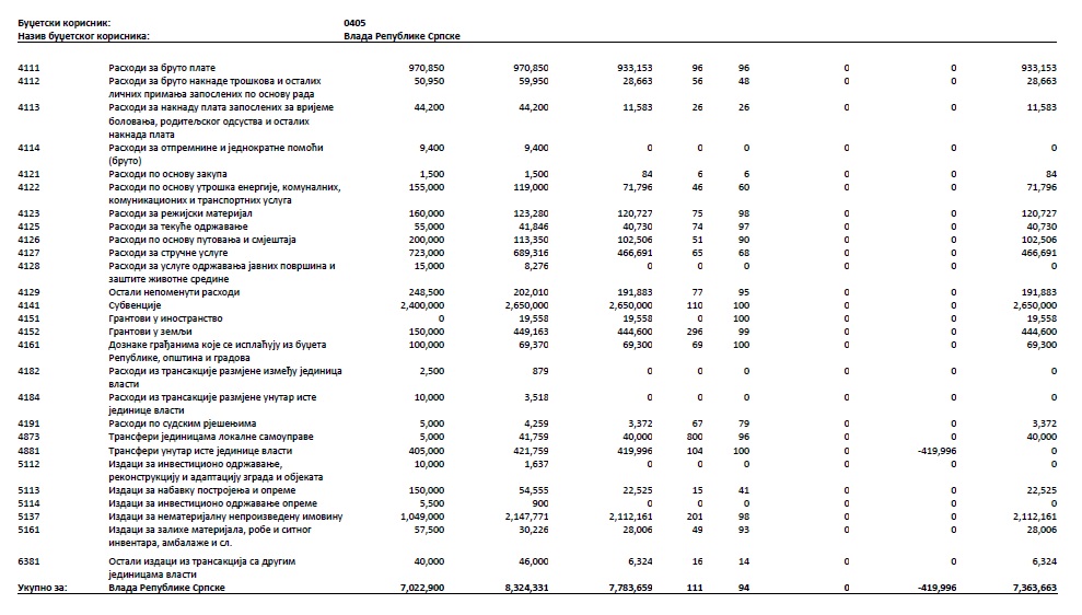 Vlada RS je po budžetu smjela da potroši 7,02 miliona, ali je potrošila 7,36 miliona KM. Povećan je iznos za subvencije, grantove u zemlji i inostranstvu, transfere jedinicama lokalne samouprave, kao i izdaci za nematerijalnu neproizvedenu imovinu.