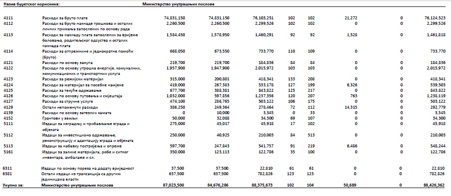Što se tiče MUP-a Srpske, budžet ove institucije za prvo polugodište bio je 87,02 miliona, a potrošeno je 88,42 miliona KM. Najveće povećanje troškova bilo je na poziciji rashodi za bruto plate, a probijen je i budžet za otpremnine i jednokratne pomoći, za utrošak struje, komunalne, komunikacione i transportne usluge, za režijski materijal, za tekuće održavanje, za putovanja i smještaj.