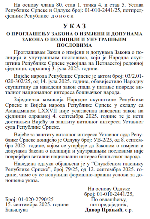 Ukaz o proglašenju sa cijelim tekstom zakona objavljen je u današnjem Službenom glasniku RS.