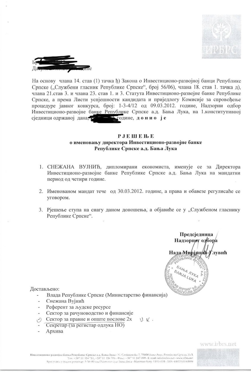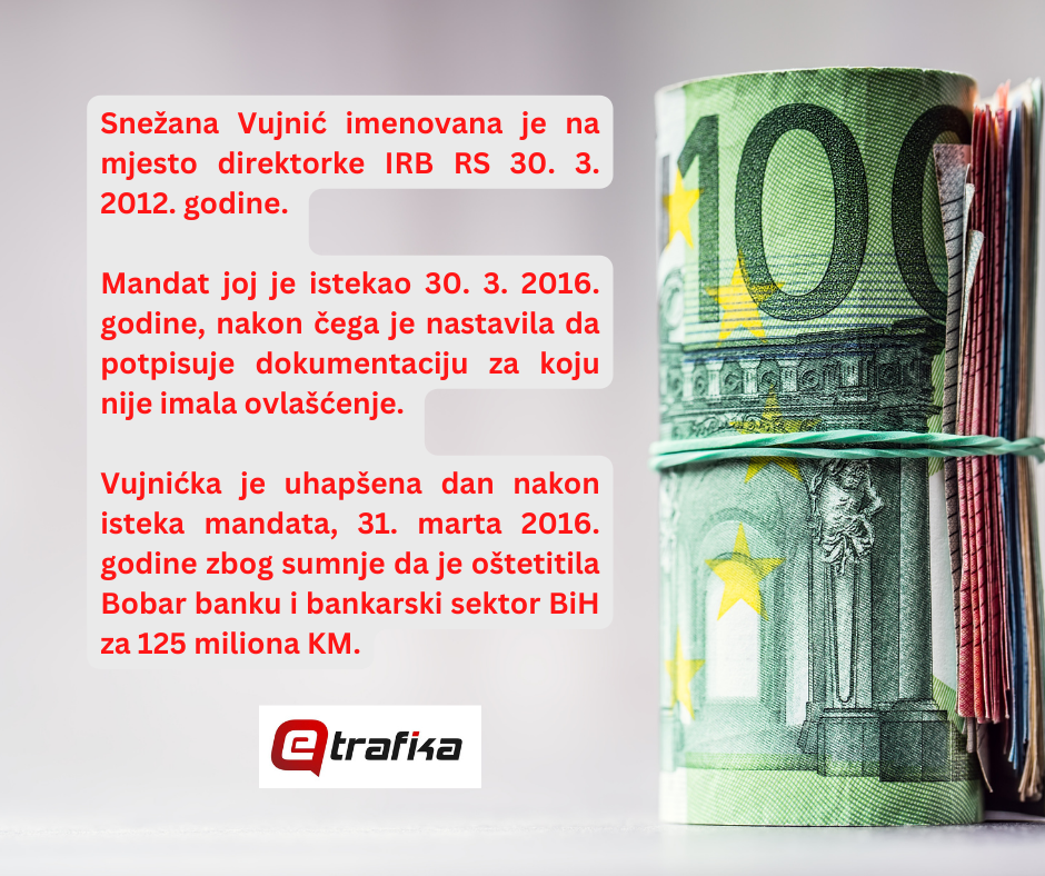 Ovo potvrđuje dokument koji je u posjedu eTrafike, a koji nedvosmisleno pokazuje od kada do kada je Vujnićka bila ovlašćena za potpis na odobrene kredite. Ona je 30. marta 2012. godine imenovana na mjesto direktora IRB-a RS, a mandat joj je istekao tačno četiri godine kasnije, nakon čega nije produžen. Vujnićka stoga nije mogla da potpisuje kreditna zaduženja, iako je sa tim nastavila pune četiri godine.