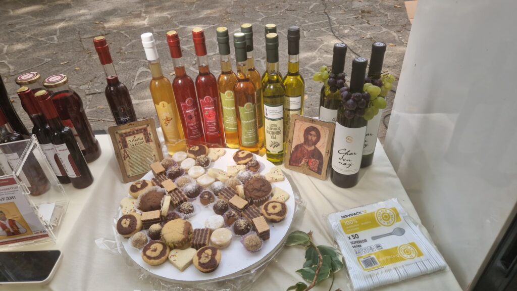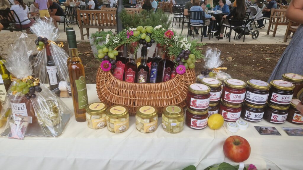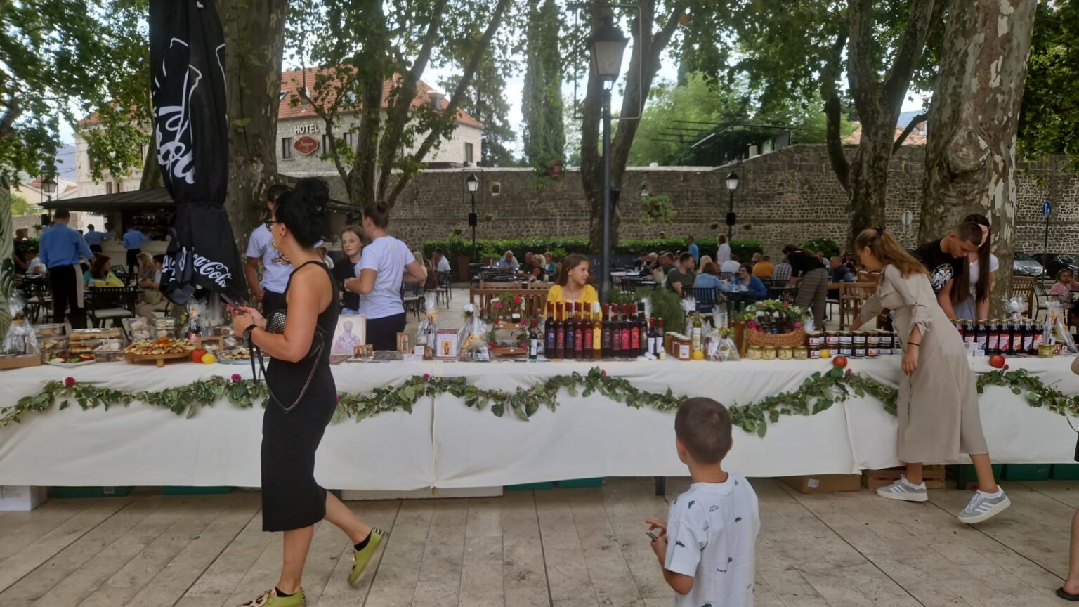 Na štandovima se smjenjuju mirisi domaćih kolača, kiflica i kanapea, dok posjetioci, između ostalog, mogu probati i kupiti hercegovački med, vino ili džem.