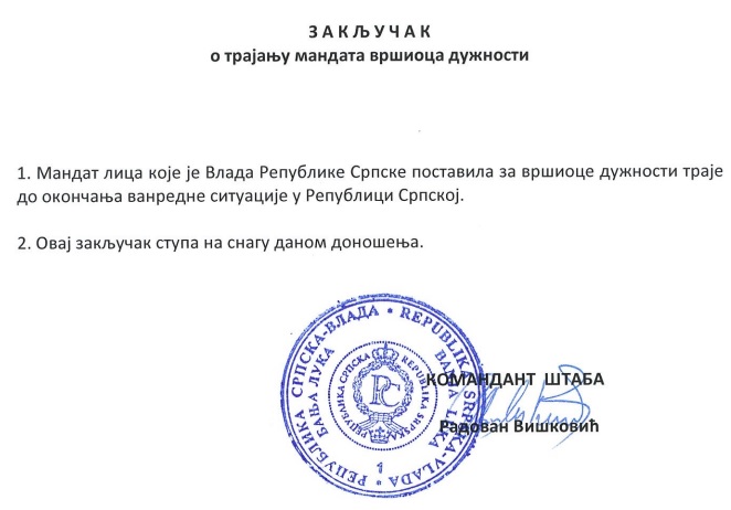 Republički štab za vanredne situacije odlučio je da mandat licima koje je Vlada Republike Srpske postavila za vršioce dužnosti (v.d.) traje do okončanja vanredne situacije proglašene zbog virusa korona.