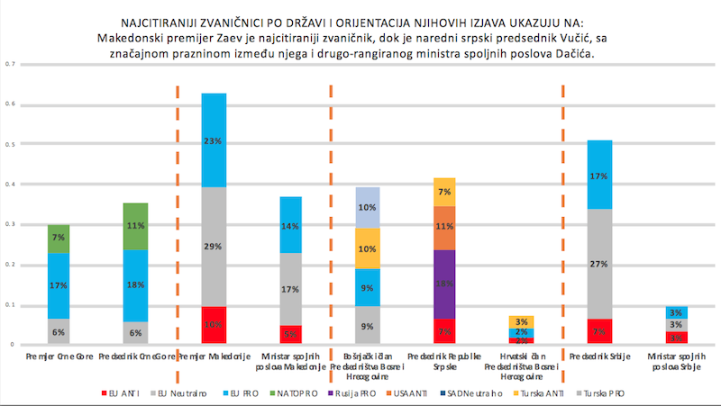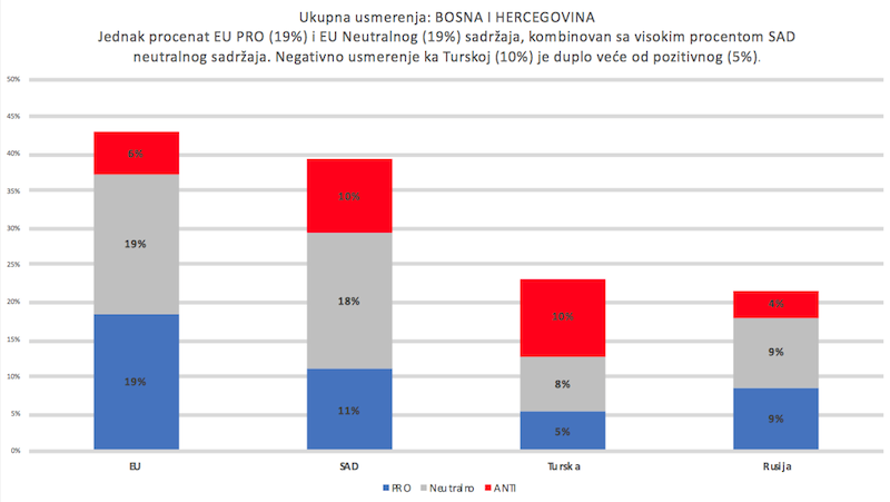 U Srbiji su objave bez izvora pretežno proruske i antiameričke orjentacije U BH medijima su antiameričke i proevropske, dok je u Crnoj Gori praktično mrtva trka između medijskih sadržaja koji naginju ka SAD i Rusiji.