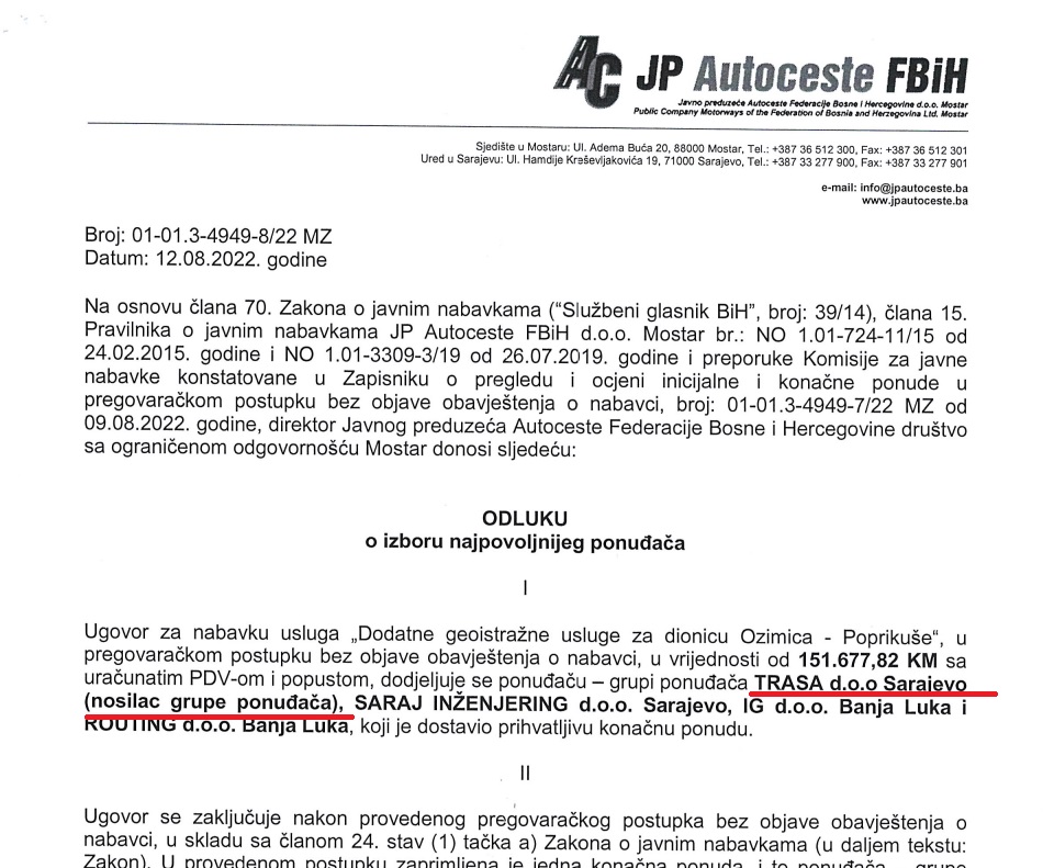 According to the documentation we obtained, the bid from Divel's consortium was 255,408 KM higher than the estimated procurement value. However, the commission decided to allocate additional funds from Autocesta's budget and accept this offer.
