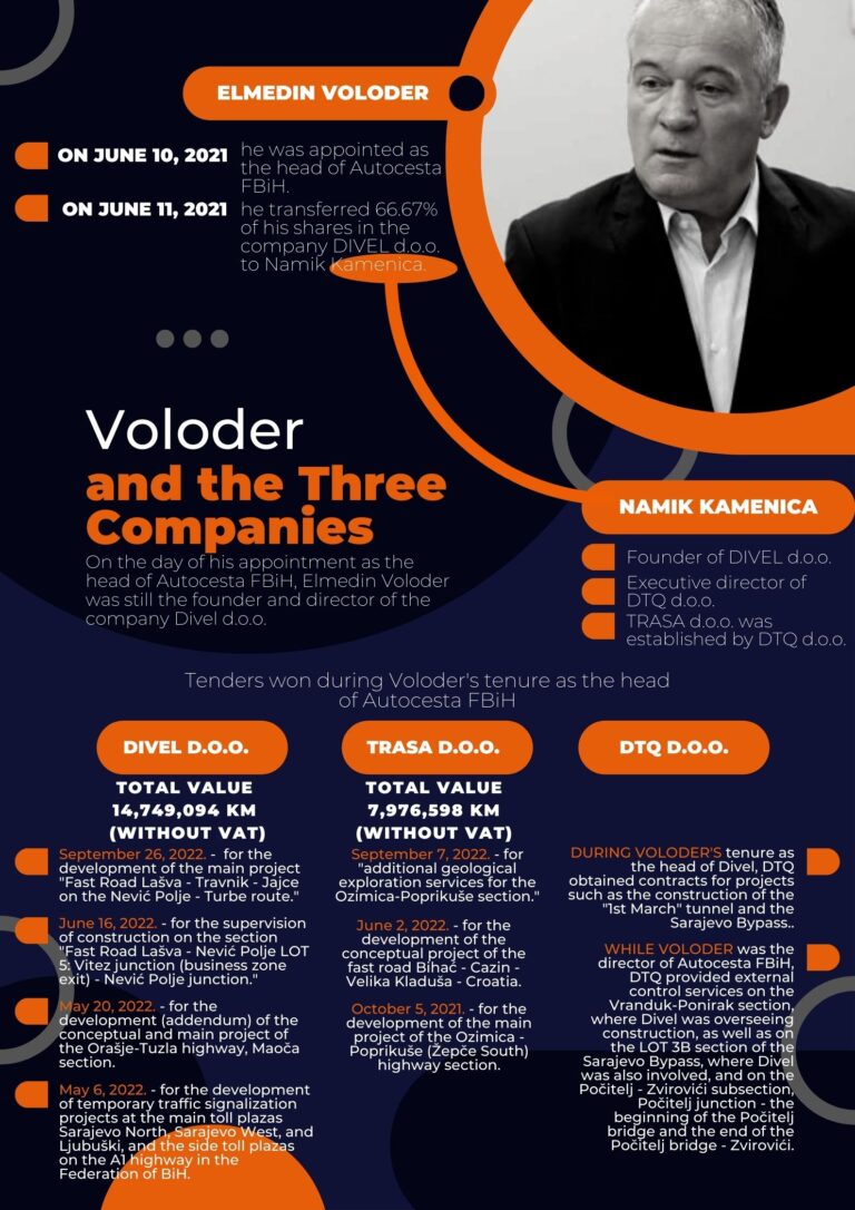 The companies that were the focus of the investigation are Divel d.o.o, followed by Trasa d.o.o, and DTQ d.o.o. Sarajevo. Divel was founded by Elmedin Voloder himself, and he managed the company as its director for several years. In the previous government, on June 10, 2021, the FBiH Government made a decision to appoint Voloder as the acting director of the FBiH Highways. On that day, Elmedin Voloder was both the founder and director of Divel, which had already secured multi-million contracts with FBiH Highways, mostly for supervision tasks, and he was also a member of the federal parliament.