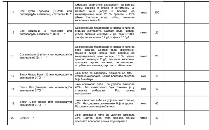 Potrebno im je i 100 paketa Vitaminkinog negaziranog soka od narandže, kao i 150 litara soka od jabuke. Specifikacije kažu da traže Bravo sok ili odgovarajući ekvivalent. Od Brava hoće i 150 litara gustog soka od breskve, a neće faliti ni gaziranih sokova – kola i fanta po 20 paketa od po dva litra.