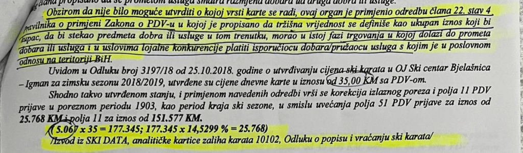 U inspekcijskom zapisniku između ostaloga piše kako je izvršen pregled prometa karata za korištenje ski liftova na Bjelašnici i Igmanu – Malo Polje za period 1.juli 2017. do 30. juna 2019, te da su preuzeti podaci vezani za promet i izdavanje ski karata putem verificiranog sistema SKI – DATA.