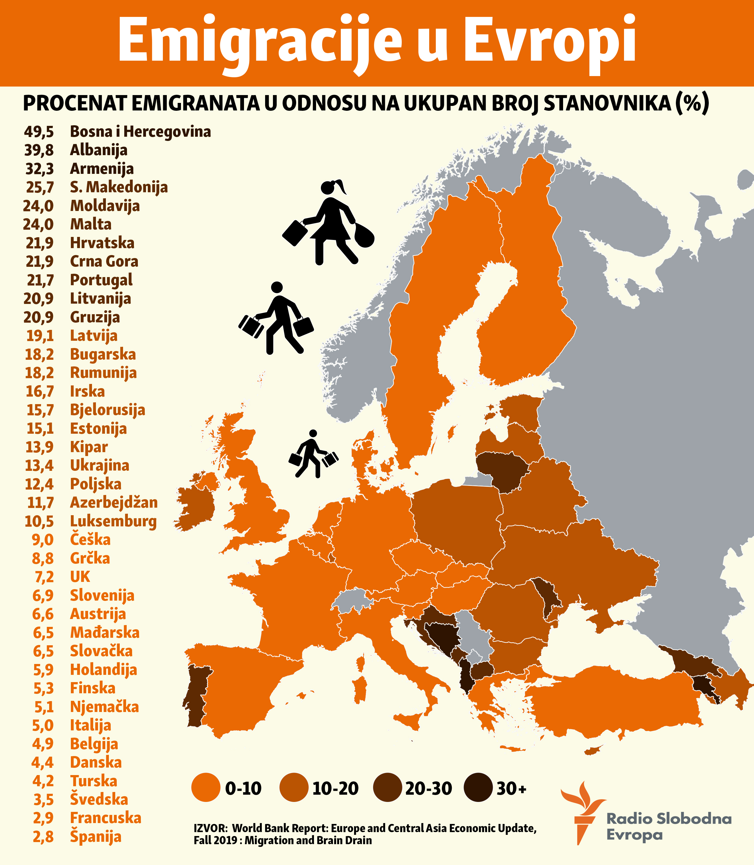 Prema izvještaju Svjetske banke pod nazivom “Migracije i odliv mozgova u Evropi i Centralnoj Aziji”, Albaniju je napustilo 39,8 posto, Sjevernu Makedoniju (25,7 posto). Hrvatsku je napustila petina stanovništva (21,9 posto) i nakon Malte, ima najveću stopu emigracije u Evropskoj uniji. I Crnu Goru je napustila petina stanovništva. Za Srbiju i Kosovo nema podataka. RSE