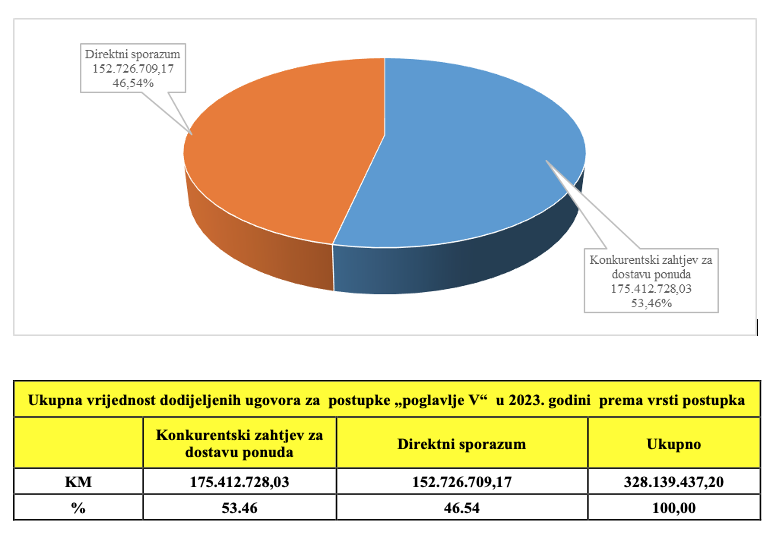 Ugovorni organi su kroz konkurentski zahtjev za dostavu ponuda realizovali javne nabavke u ukupnoj vrijednosti od 175.412.728,03 KM, dok su putem direktnih sporazuma sklopili ugovore u vrijednosti od 152.726.709,17 KM. Zbirna vrijednost svih postupaka u ovom segmentu iznosi 328.139.437,20 KM.
