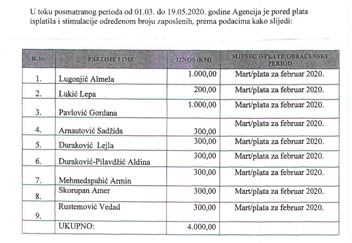 Ali, u obrazloženju je navedeno da su pojedinačne stimulacije od po 100 i 150 KM pojedini uposlenici FIPA-e dobijali jer “pored redovnih poslova zaposleni su doprinosili blagovremenom i efikasnom funkcionisanju Agencije za unapređenje stranih investicija u Bosni i Hercegovini u uslovima prirodne nesreće uz povećan rizik kontakata sa strankama i drugim uposlenicima“.