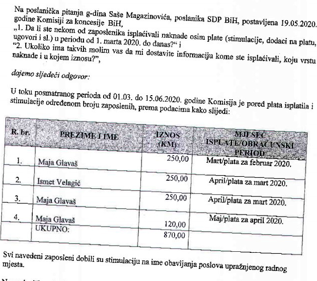 Ova komisija ništa ne radi ni u normalnim okolnostima, tako da nije jasno zbog čega su isplaćivane stimulacije za dvoje njenih uposlenika u martu i aprilu, a u zvaničnom obrazloženju navedeno je da su ih dobili zbog “obavljanja poslova upražnjenog radnog mjesta”.