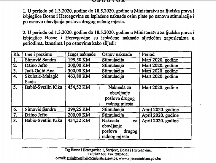 Posebno su apsurdne isplate stimulacija u vrijeme pandemije koronavirusa primjerice u Ministarstvu za ljudska prava i izbjeglice BiH. Naime, neki uposlenici ovog ministarstva dobijali su mjesečno i po nekoliko stotina maraka stimulacije, a da nije poznato da su pomogli da neka od ugroženih kategorija stanovništva ili pojedinac u zemlji u to vrijeme ostvari neko od svojih prava koja su mu bila uskraćena.