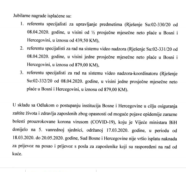 Ni Sud Bosne i Hercegovine nije odolio da u vrijeme najveće krize isplati dvije jubilarne nagrade u iznosu od po 879 KM dvojici referenata specijalista za rad na sistemu videonadzora, te jednom referentu specijalisti za upravljanje predmetima u iznosu od 439,50 KM.