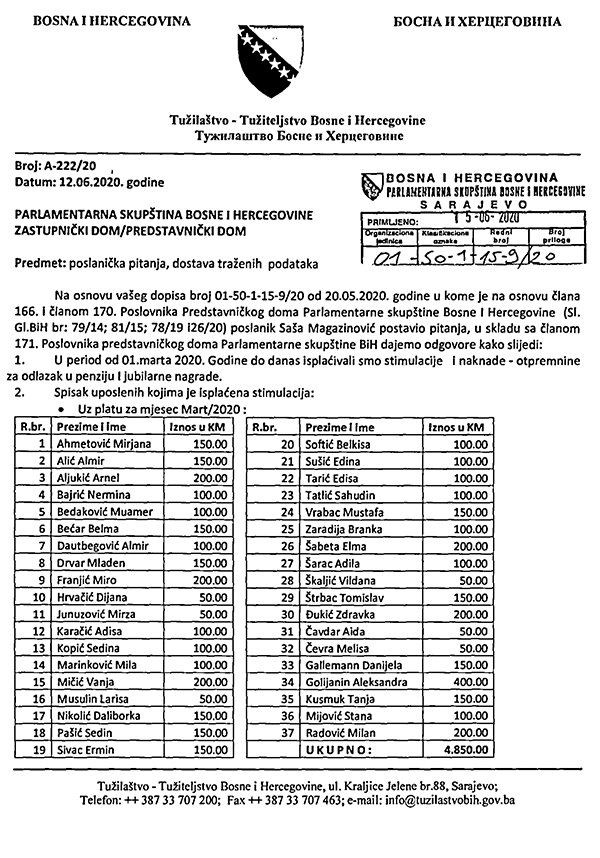 I Tužilaštvo BiH isplaćivalo je tokom marta i aprila stimulacije za više od 20 uposlenih, a nisu propustili nagraditi ni angažirane u raznim komisijama.