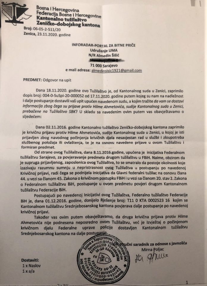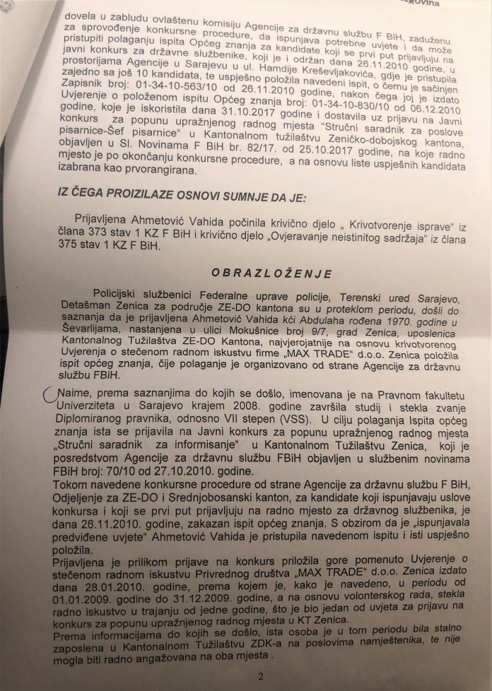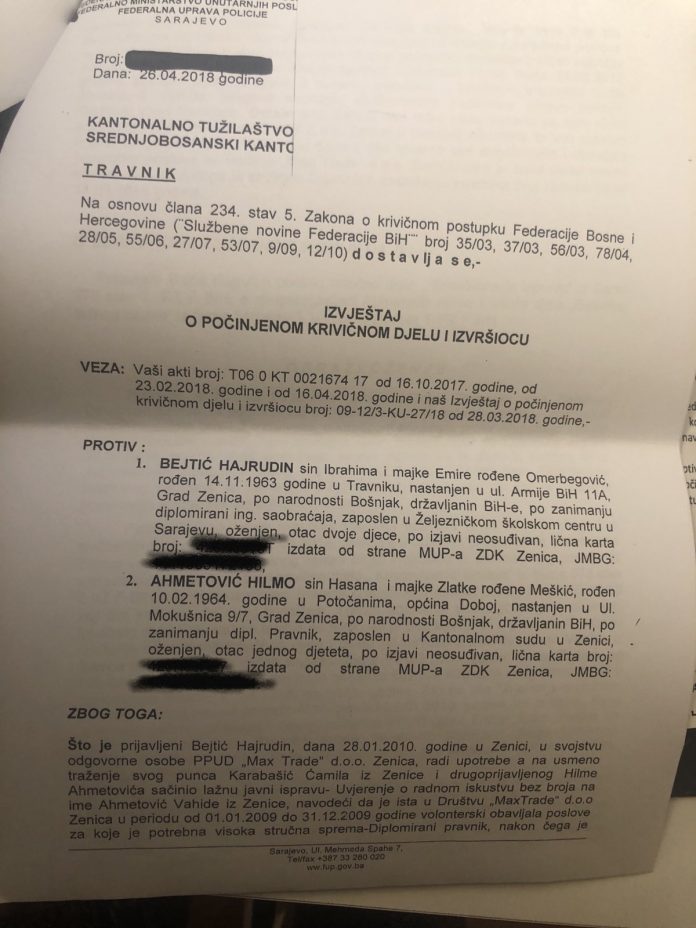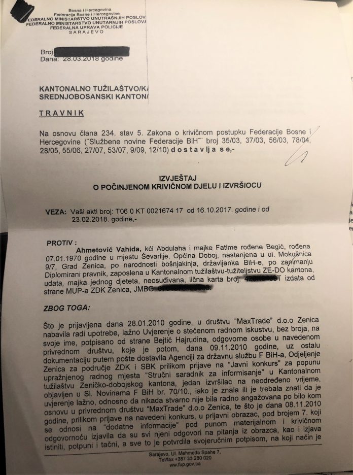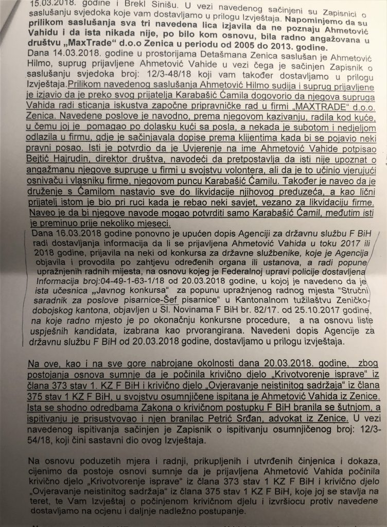 „Vezano za Vaš upit koji se odnosi na postupanje u predmetu Ahmetović Vahida i drugi, obavještavamo vas da je Federalna uprava policije, Terenski ured Sarajevo, Detašman Zenica, pod nadzorom tužilaštva SBK provela istragu i nakon prikupljenih činjenica i dokaza u vezi konkretnog podnijela Izvještaje o počinjenom krivičnom djelu i izvršiocima protiv: Ahmetović Vahide, uposlenice KT ZDK zbog krivičnih djela ‘krivotvorenje isprave’ i ‘ovjeravanje neistinitog sadržaja’, a vezano za prijavu uposlenice KT ZDK Ahmetović Vahide na Javni konkurs u pogledu popune pozicije stručnog saradnika za poslove pisarnice-šef pisarnice u KT ZDK, a koji je objavljen dana 25.10.2017. u ‘Službenim novinama FbiH’ broj 82/17. Istovremeno napominjemo da je u konkretnom slučaju podnesen izvještaj o počinjenom krivičnom djelu i izvršiocima protiv Bejtić Hajrudina, koji je sačinio lažnu ispravu-uvjerenje o radnom iskustvu Ahmetović Vahide u društvu Max trade doo Zenica, iako je znao da navedene poslove imenovana nije obavljala u društvu Max trade. Također, Izvještaj je dostavljen i protiv Ahmetović Hilme, koji je suprug prijavljene Ahmetović Vahide, a ujedno i sudija Kantonalnog suda u Zenici, zbog toga što je u svojstvu svjedoka u krivičnom predmetu protiv Ahmetović Vahide policijskim službenicima FUP-a svjesno dao lažni iskaz vezano za radni angažman njegove supruge Ahmetović Vahide u  društvu Max trade doo Zenica, iako je znao da taj navod nije tačan. U pogledu navedenog, ova Uprava nikada nije obavještena zvanično kako od KT SBK tako i od Općinskog suda Travnik o krajnjem ishodu postupka po podnesenim Izvještajima protiv navedenih lica“, odgovorili su iz FUP-a na pitanja Inforadara.