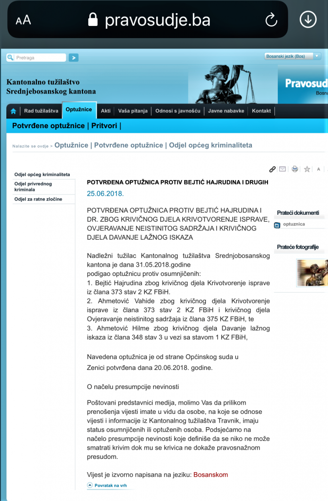 Saznajemo da je 31. maja 2018. nadležno Tužilaštvo SBK, a na osnovu rezultata istrage koja potvrđuje osnovanost krivične prijave, podiglo optužnicu protiv osumnjičenih: Vahide i Hilme Ahmetović te Hajrudina Bejtića. Zanimljivo je da je ova optužnica je 20. juna 2018. godine potvrđena od Općinskog suda u Zenici koji, međutim, nije u nadležnosti pravosudnih institucija SBK!