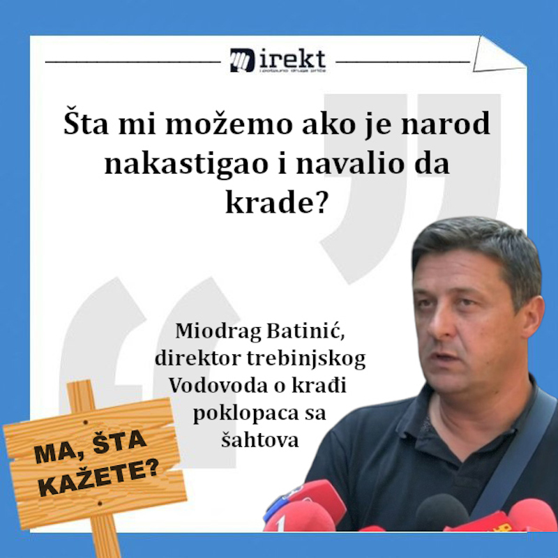 Direktor trebinjskog Vodovoda Miodrag Batinić je za “Direkt” komentarisao krađu poklopaca sa šahtova. Poslednji slučaj je prouzrokovao povredu dvoje ljudi. “Šta mi možemo ako je narod nakastigao i navalio da krade”, rekao je Batinić.