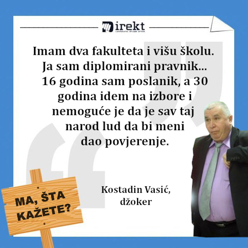 “Imam dva fakulteta i višu školu. Ja sam diplomirani pravnik. Bio sam zamjenik ministra bezbjednosti, rukovodio upravljanjem resursima i prošao sve provjere NATO-a i svih bezbjednosnih službi, 16 godina sam poslanik, a 30 godina idem na izbore i nemoguće je da je sav taj narod lud da bi meni dao povjerenje. Završio sam Višu školu za sportske trenere i čitav život sam se bavio fudbalom”, naveo je svojevremeno Vasić.