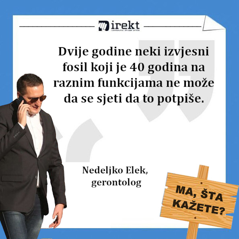 „Dvije godine neki izvjesni fosil koji je 40 godina na raznim funkcijama ne može da se sjeti da to potpiše“, rekao je Nedeljko Elek optuživši Ministarstvo saobraćaja i veza da već dvije godine ne daje saglasnost za upotrebu puta Pale-Jahorina. i dodao da će pustiti put ako Nedeljko Čubrilović uskoro ne da saglasnost.