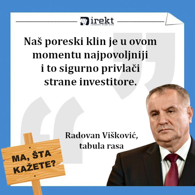 “Republika Srpska nudi najpovoljnije uslove za privređivanje. Porez na lična primanja i indirektno oporezivanje je među najmanjima, cijena električne energije je ubjedljivo najmanja, nema dividende, naš poreski klin je u ovom momentu najpovoljniji i to sigurno privlači strane investitore”, rekao je Radovan Višković, premijer RS.