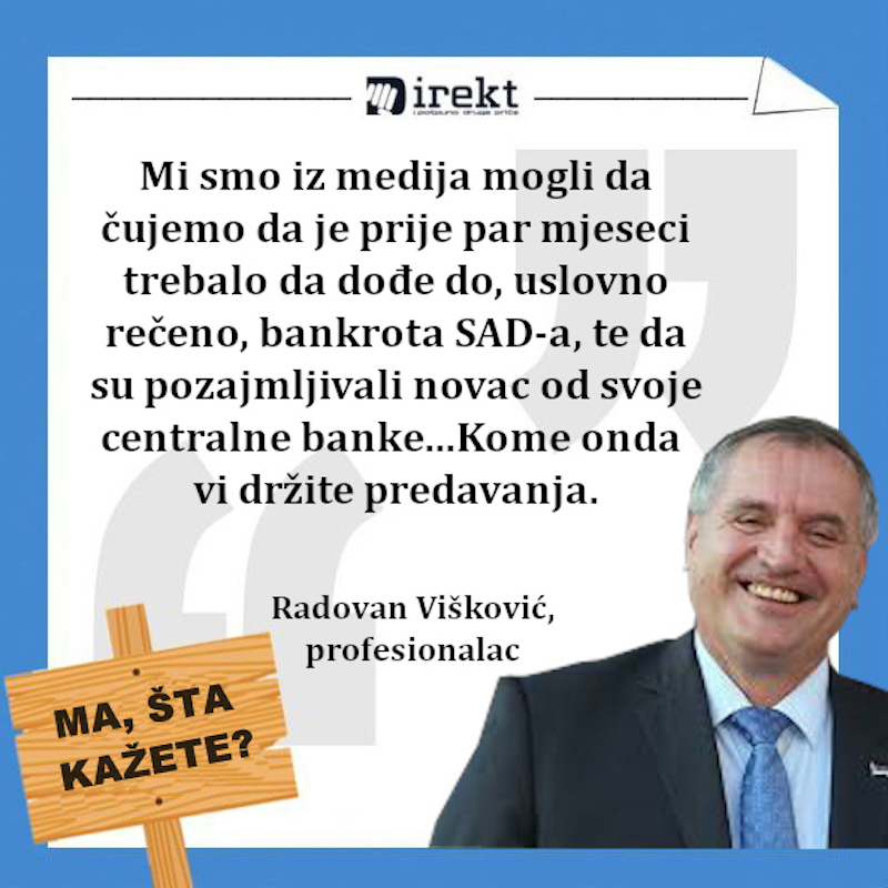 “Mi smo iz medija mogli da čujemo da je prije par mjeseci trebalo da dođe do, uslovno rečeno, bankrota Sjedinjenih Država, te da su pozajmljivali novac od svoje centralne banke kako bi se sačuvali od toga. Kome onda vi držite predavanja?”, upitao je Radovan Višković, premijer RS.