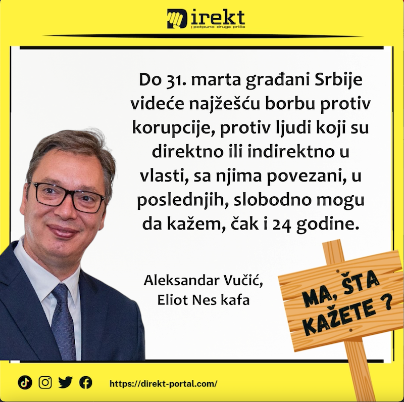 “Do 31. marta građani Srbije videće najžešću borbu protiv korupcije, protiv ljudi koji su direktno ili indirektno u vlasti, sa njima povezani, u poslednjih slobodno mogu da kažem čak i 24 godine”, rekao je Vučić tokom gostovanja u emisiji “Četvrtkom u 9”, na javnom emiteru Srbije, RTS-u
