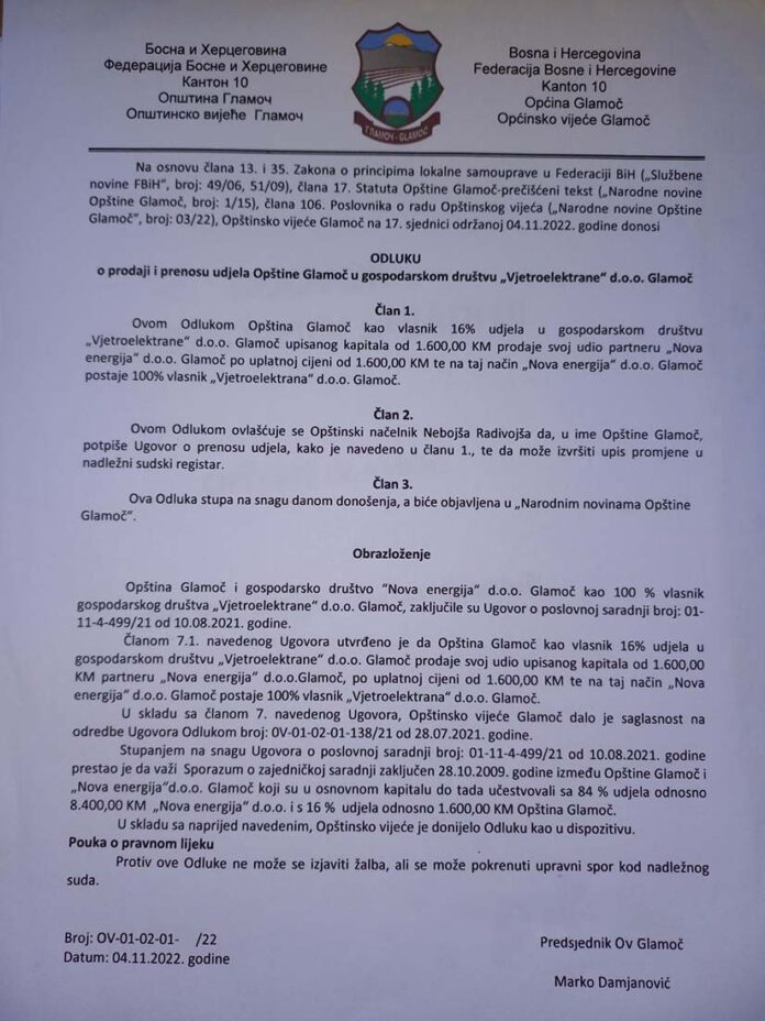 U Ugovoru se, između ostalog, navodi da se Glamoč obavezuje da će zemljište koje se nalazi u vlasništvu opštine, na kojem je predviđena izgradnja vjetroparkova “Slovinj” i “Dževa”, preduzeću “Nova energija” dati na korištenje bez naknade i to na period od 30 godina, uz mogućnost produženja u skladu sa koncesionim ugovorom.