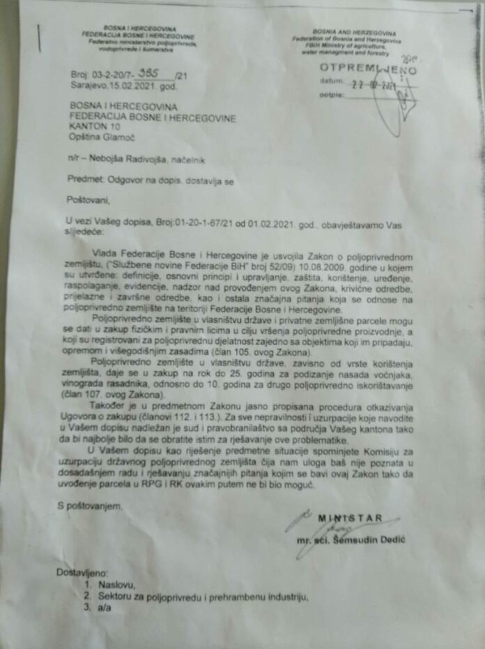 “Od 2020. godine opština Glamoč je u situaciji da je poljoprivredno zemljište uzurpirano od strane poljoprivrednih proizvođača, uglavnom onih koji su imali Ugovor o zakupu poljoprivredog zemljišta sa Opštinom Glamoč. Sve parcele koje se vode na Opštini Glamoč su pod uzurpacijom i nalaze se pod usjevima”, navodi se, između ostalog, u pomenutom dopisu.