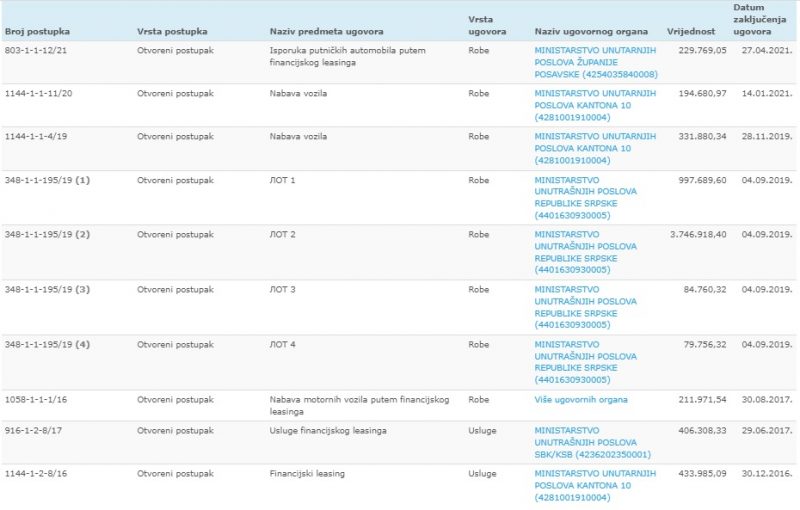 Other public institutions also opt for operational leasing, but usually in cases where they procure a significantly smaller number of vehicles. Only the MIA RS is generous, directing millions to Porsche Leasing. Analyzing the contracts that this company has concluded with other ministries in Bosnia and Herzegovina, which are published on the Public Procurement Portal, we noticed that in all cases, except for the MIA RS, they opted for financial leasing.