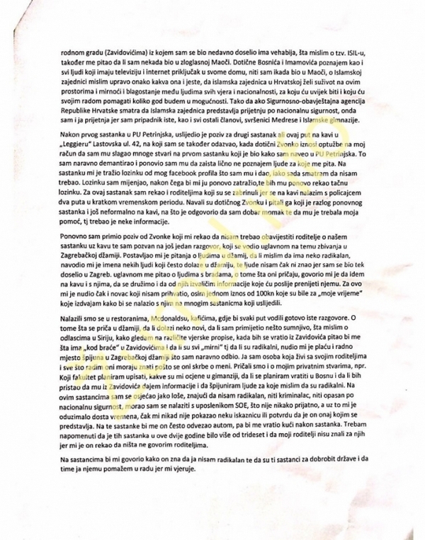 Prigovor na rad uposlenika SOA-e dostavljen u tu obavještajnu agenciju 19. 7. 2016. godine., na adresu Savska cesta 39/1. Bh. državljanin E.O., rođen u Zavidovićima, tada privremeno nastanjen u Zagrebu, izvijestio je rukovodstvo SOA-e da ga službenik te Agencije tjerao na saradnju, tjerao na druženje sa selefijama, na odlazak u Gornju Maoču i Bočinju, te konstantno vršio pritisak na njega da se druži sa pripadnicima selefijkog pokreta.