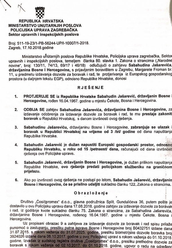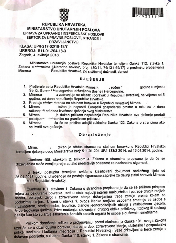 Nakon što je odbio izvršavati upute obaveštajaca, MUP Republike Hrvatske je, na prijedlog SOA-e, donio Rješenje broj: 511-19-23/1 PB-58162-UP/ I-3170/1-16 kojim bh državljanina E.O. proglašava „opasnošću po nacionalnu sigurnost Republike Hratske“.