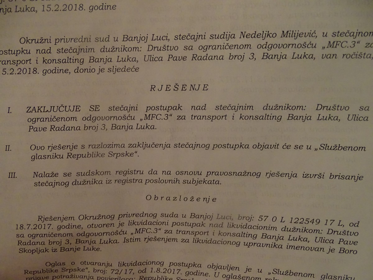 U februaru prošle godine Okružni privredni sud u Banjoj Luci donio je Rješenje o Zaključenju stečajnog postupka nad stečajnim dužnikom „M.F.C.3“. Uvidom u stečajnu dokumentaciju zaključuju se da je firma „M.F.C. 3“ od osnivanja imala samo jedno zaposleno lice. To je bio Bojan Đokić.