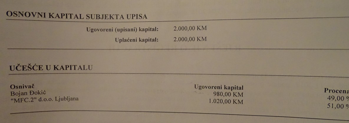 Firma za transport i savjetovanje „M.F.C..3“ iz Banje Luke registrovana je u banjalučkom Okružnom sudu. Vlasnici ove kompanije su „M.F.C.2“ iz LJubljane i Bojan Đokić, sin ministra Petra Đokića.