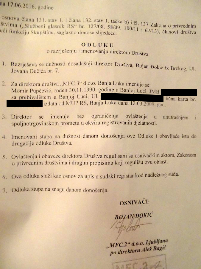Budući da poslovanje nije išlo kako treba, Bojan Đokić je, zajedno sa partnerom „M.F.C.2“, odlučio da dugovanja prebaci na drugo lice. Tačnije, došlo je do promjene na čelu firme. Sredinom juna 2016. godine donesena je Odluka o njegovom razrešenju. Na mjesto direktora firme „M.F.C. 3“ postavljen je Momir Pupčević iz Banje Luke koji je u bliskim rodbinskim vezama sa jednim istaknutim članom Socijalističke partije.