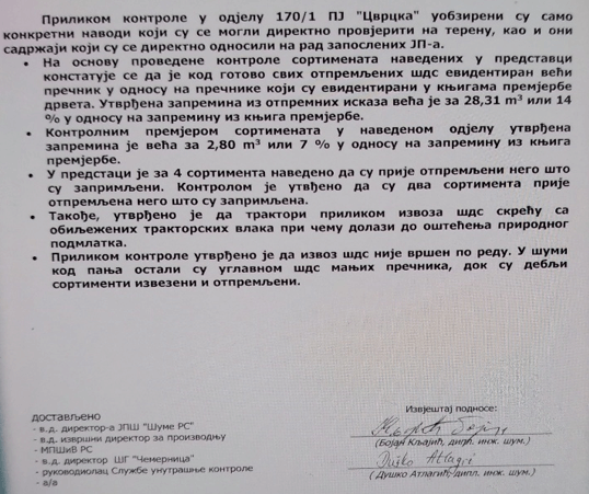 „Konstatuje se da je kod gotovo svih otpremljenih ŠDS evidentiran veći prečnik u odnosu na prečnike koji su evidentirani u knjigama premjerbe drveta. Utvrđena zapremina iz otpremnih iskaza veća je za 28.3 kubna metra, ili 14 odsto u odnosu na zapreminu iz knjiga premjerbe. Kontrolnim premjerom sortimenata u navedenom odjelu utvrđena zapremina je veća za 2.8 kubnih metara ili 7 odsto u odnosu na zapreminu iz knjiga premjerbe. Utvrđeno je i da su dva sortimenta prije prije otpremljena nego što su zaprimljena“, navodi se u izvještaju.