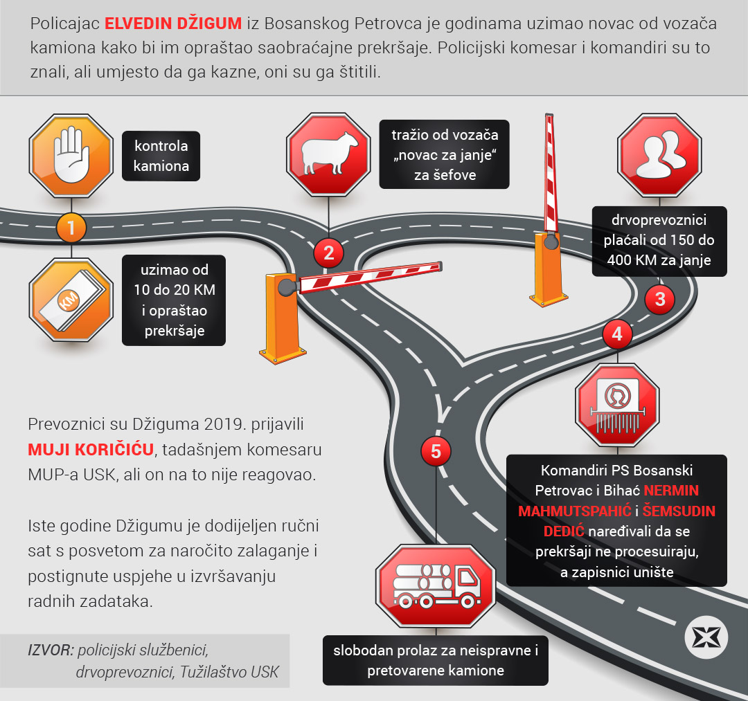 Tužilaštvo USK je optužilo policajce Džiguma i Šobota te komandire Mahmutspahića i Dedića za zloupotrebu položaja ili ovlaštenja kojim su pribavljali korist drvoprevoznicima. Šobot je u službenu bazu unosio kazne koje je Džigum umanjivao, a Mahmutspahić i Dedić su naređivali da se prekršaji ne procesuiraju ili zapisnici o prekršaju unište.