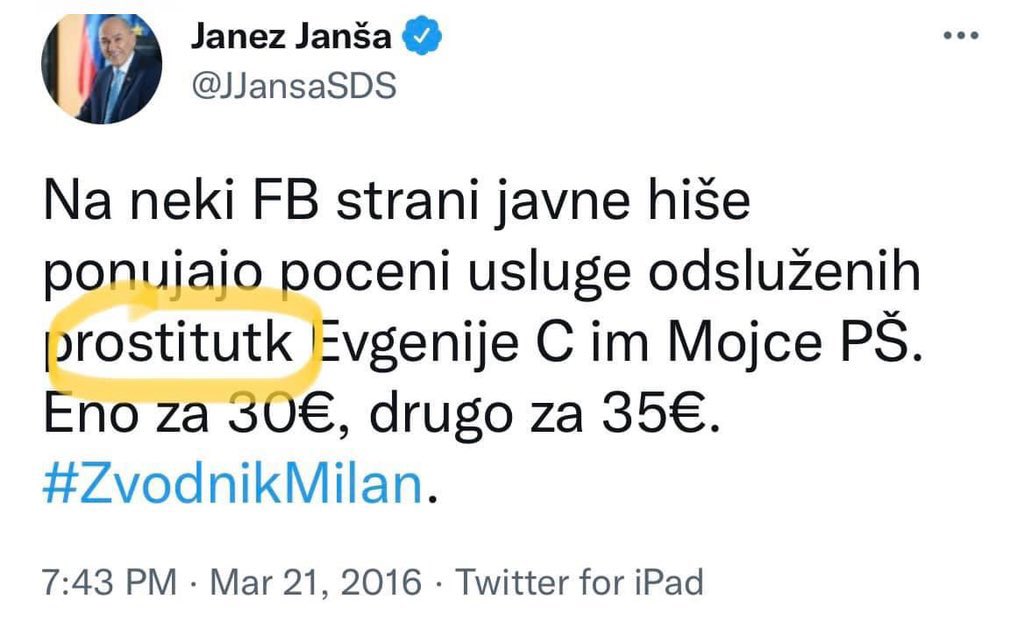 Sve je počelo u martu 2016. godine, kada je Janša, koji je tada obnašao funkciju poslanika u slovenačkom parlamentu, na svom Twitter nalogu novinarke RTV Slovenija Eugeniju Carl i Mojcu Šetinc Pašek nazvao „odsluženim prostitutkama“. U tweetu je još spomenut „svodnik Milan“, što se odnosi na nekadašnjeg slovenačkog predsjednika Milana Kučana, koji je za Janeza Janšu vječiti trn u peti, premda je Kučan posljednji put bio akter na političkoj sceni Slovenije prije ravno dvije decenije.