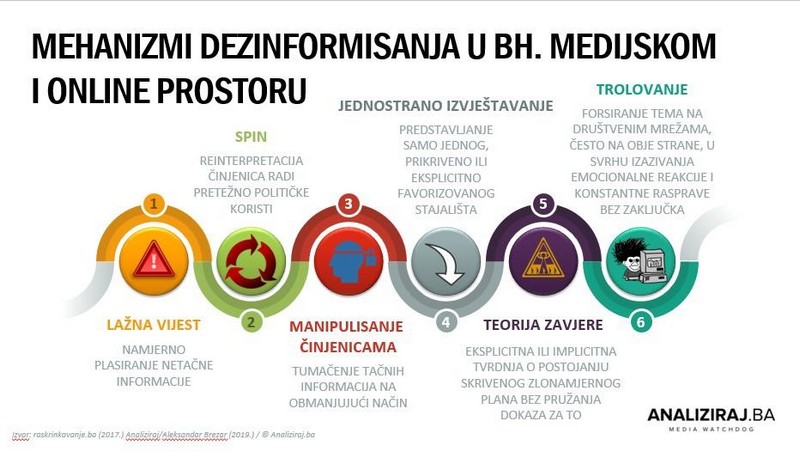 I dok su, kada je dezinformisanje u pitanju, u svijetu aktuelne rasprave o tome treba li lažne vijesti svrstavati pod dezinformacije ili, možda, koristiti treći termin – „misinformacije“, kako to preferira institut Poynter, najveći i najznačajniji autoritet među factchecking organizacijama, mi smo još uvijek u fazi detektovanja problema. „Misinformacije“ se od dezinformacija ipak razlikuju u jednoj krajnje bitnoj stvari: dok je kod „misinformacija“ na djelu greška, pa možemo govoriti o defektnim informacijama, kod dezinformacija je riječ o namjernoj prevari. Ipak, specifični dezinformacioni alati i mehanizmi u našem medijskom i online prostoru, ako se fokusiramo samo na maligne pojave, mogli bi se svesti na sljedeće: