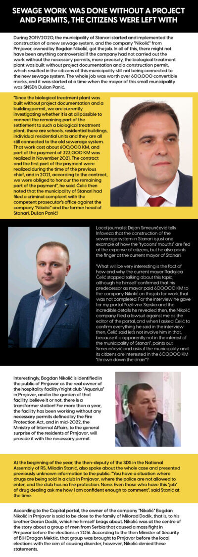 During 2019/2020, the municipality of Stanari started and implemented the construction of a new sewage system, and the company “Nikolić” from Prnjavor, owned by Bogdan Nikolić, got the job. In all of this, there might not have been anything controversial if the company had not carried out the work without the necessary permits, more precisely, the biological treatment plant was built without project documentation and a construction permit, which resulted in the citizens of this municipality still not being connected to the new sewage system. The whole job was worth over 600,000 convertible marks, and it was started at a time when the mayor of this small municipality was SNSD’s Dušan Panić.