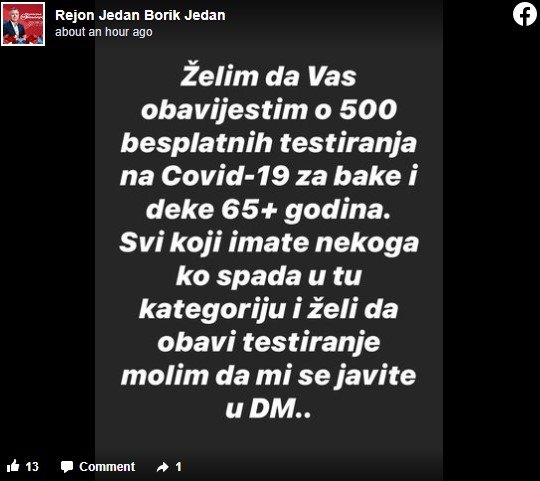 Tako je banjalučki SNSD iz naselja Borik, putem svoje društvene mreže, obznanio da ova stranka ima 500 testova “za bake i deke”. Poklon test se, kako su objasnili, dobija tako što se prijavite u njihovu područnu kancelariju i zatražite besplatno testiranje, nakon čega ćete biti upućeni u jednu privatnu laboratoriju.