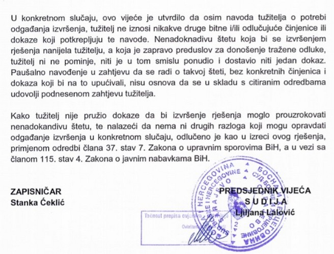 „Sud može odgoditi izvršenje konačnog upravnog akta na određeno vrijeme i do konačne sudske odluke, ako tužitelj konkretno navede okolnosti i činjenice koje bi ukazivale da bi se izvršenjem osporenog akta njemu nanijela nenadoknadiva šteta, kao i da priloži odgovarajuće dokaze o tim činjenicama i okolnostima. Osim toga, tužitelj je dužan da ukaže na činjenice i dostavi dokaze iz kojih proizlazi da odgoda izvršenja konačnog upravnog akta nije protivna javnom interesu. Prema tome, tužitelj u zahtjevu za odgađanje izvršenja konačnog upravnog akta mora pružiti odgovarajuće dokaze ili bar učiniti vjerovatnim da su navedeni zakonski uslovi ispunjeni posebno u pogledu štete koja bi izvršenjem konačnog upravnog akta njemu bila nanesena“, stoji u rješenju.