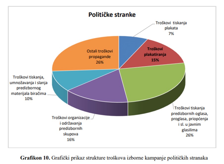 Kao što se može vidjeti iz priloženih podataka, najveći udio u troškovima predizborne kampanje čine “ostali troškovi propaganda” – 26,04 posto, šta god se pod tim podrazumijevalo. Na troškove štampanja predizbornih oglasa, proglasa, saopštenja i slično u javnim glasnicima potrošeno je 25,82 posto, dok su političke stranke najmanje sredstava izdvojile na troškove štampanja plakata, odnosno 7,07 posto.