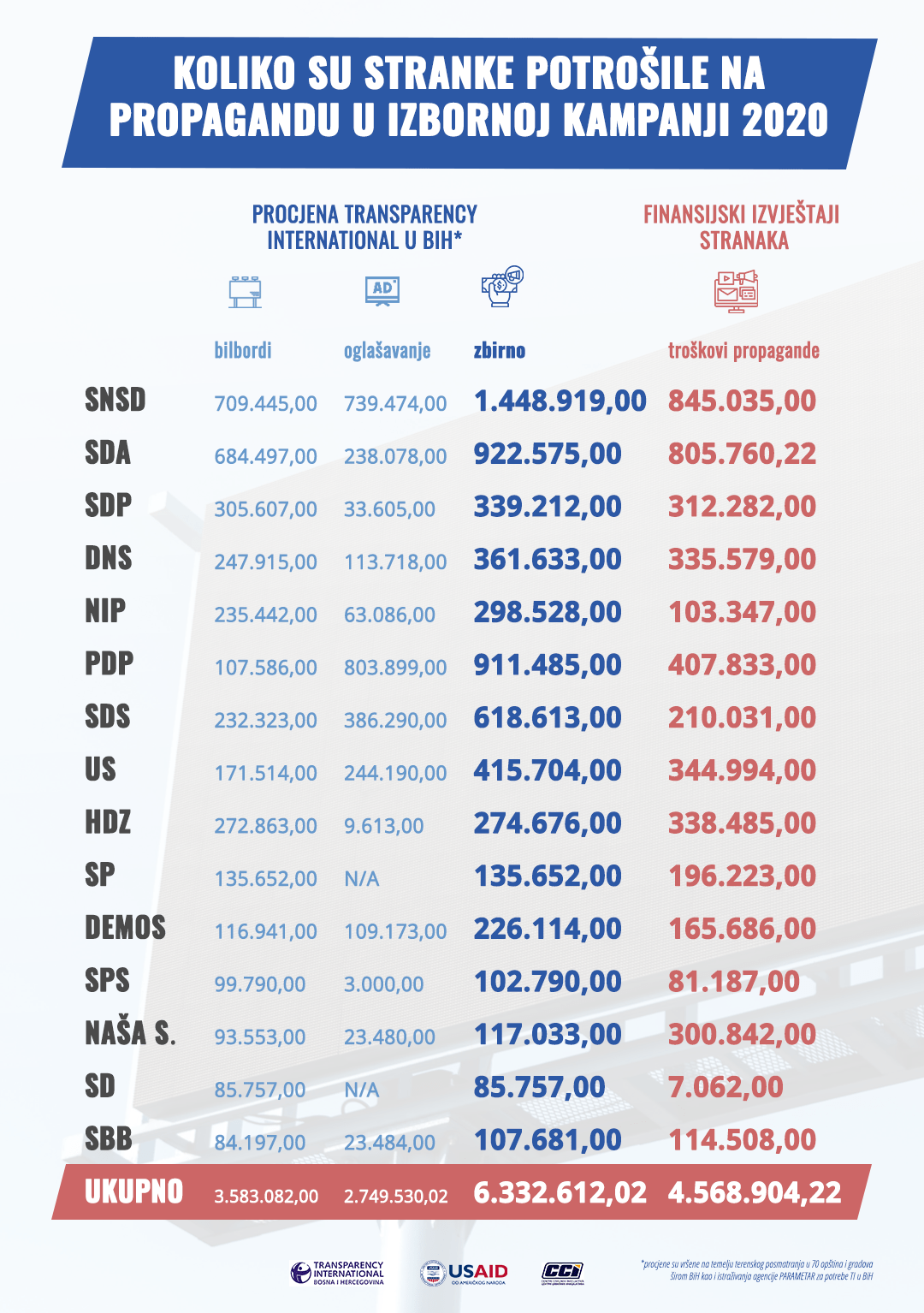 Petnaest vodećih političkih stranaka u Bosni i Hercegovini prikazalo je u svojim postizbornim izvještajima za protekle lokalne izbore 4,5 miliona KM troškova propagande. Ipak samo troškovi medijskog i vanjskog oglašavanja (putem bilborda) koje je tokom protekle kampanje evidentirao Transparency International u BiH (TI BIH) za najmanje 1,8 miliona KM premašuju ovaj iznos, što jasno pokazuje da stranke nisu realno prikazale informacije o finansiranju.