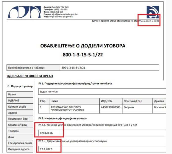 Načelniku Vlasenice, Miroslavu Kraljeviću, očigledno je bilo veoma stalo da ovaj posao dodijeli Erićevoj firmi, s obzirom na maksimalno skraćene rokove u procedurama javnih nabavki. Naime, obavještenje o javnoj nabavci objavljeno je 28. decembra prošle godine, dok je 17. januar bio krajnji rok za preuzimanje tenderske dokumentacije. Samo dan kasnije, 18. januara, istekao je rok za dostavljanje ponuda, a već 19. januara, načelnik Kraljević je potpisao Odluku o izboru najpovoljnijeg ponuđača.