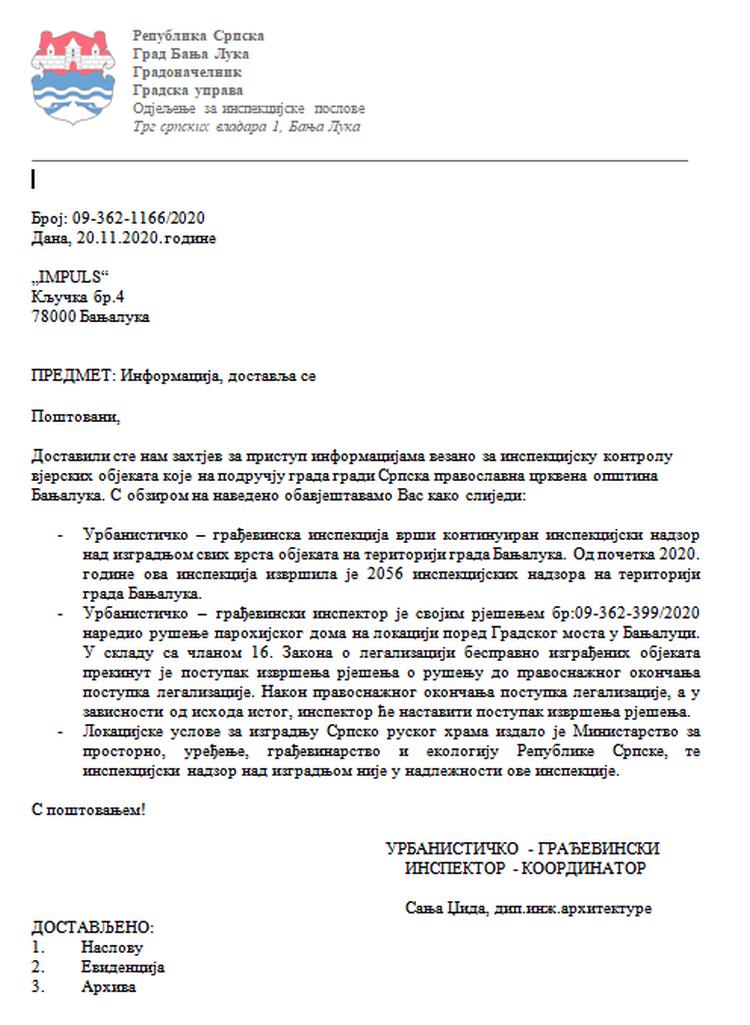 „Obavještavamo vas da je urbanističko-građevinski inspektor izvršio inspekcijsku kontrolu i zapisnički konstatovao da je SPCO „Bogojavljenski hram“, kao investitor otpočeo izgradnju objekta na navedenoj parceli bez prethodno pribavljene građevinske dozvole. Shodno navedenom doneseno je rješenje o rušenju izvedenih radova“, navodi se između ostalog u odgovoru iz Odjeljenja za inspekcijske poslove grada Banjaluke.